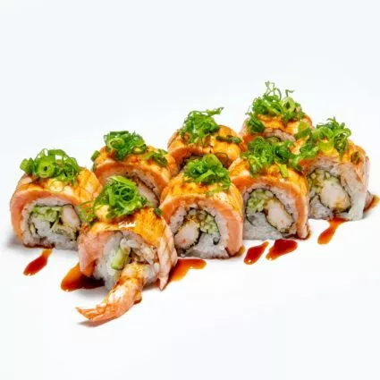 Запечений лосось гриль, соус спайсі, зелена цибуля, огірок, креветка в хрусткому клярі, соус унагі.