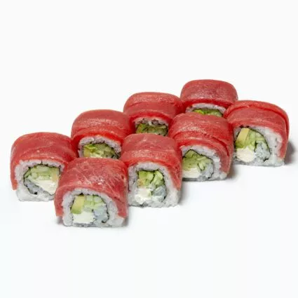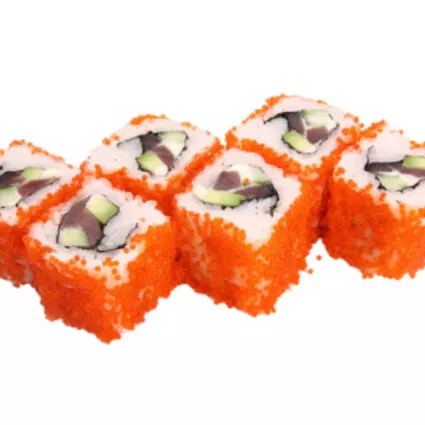 Тунець Bluefin, ікра тобіко, майонез, огірок, авокадо.